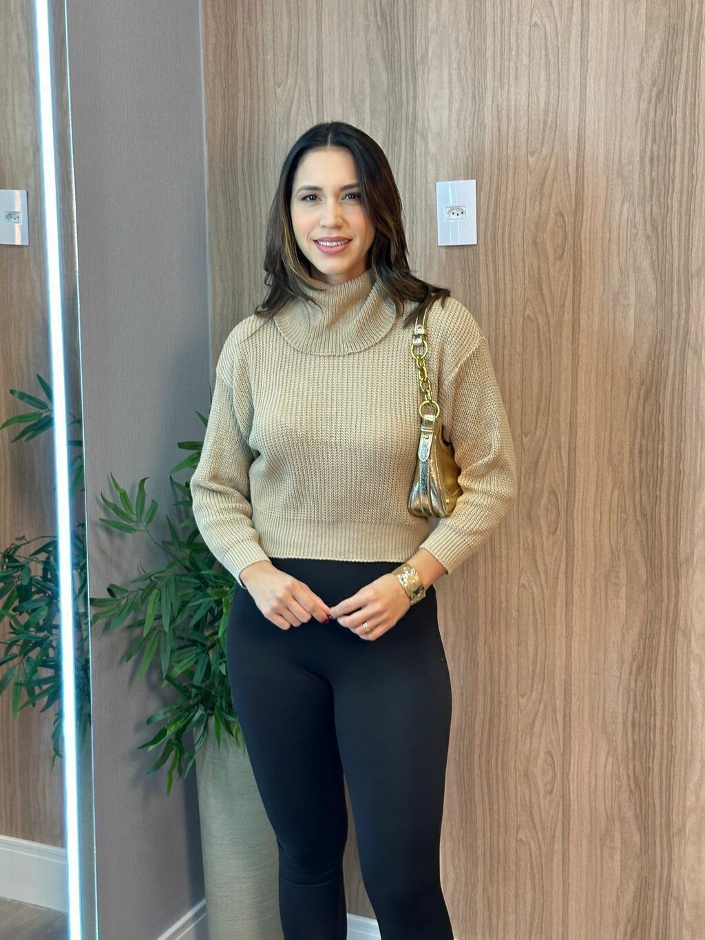 Feito em tricot macio e quentinho, este cropped é o abraço que seu corpo merece. Com manga longa para esquentar até o coração, ele veste até o tamanho 44 com conforto e charme.
